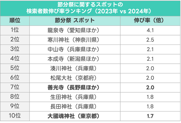 2023年から2024年にかけて、節分祭に関するスポットの検索者数が増加していることがわかりました。その中でも特に注目を集めたのは愛知県の「龍泉寺」で、検索者数は2023年と比較してなんと4.1倍に達しました。龍泉寺では、特別な節分会が開催され、祈祷を受けた人々が豆まきに参加できる機会が提供されています。