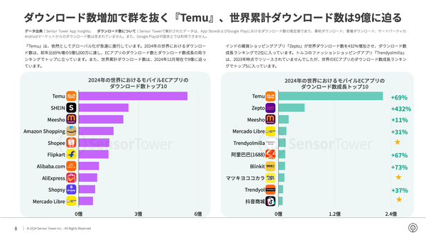 『Temu』は2024年も引き続き急速に展開しており、モバイルアプリのダウンロード数ランキングで1位を獲得しています。ECアプリのダウンロード数と成長においてもトップの座を占めており、2024年には前年に比べ69%の増加、5億5,000万のダウンロードを達成、さらに12月には累計ダウンロード数が9億を超える勢いです。