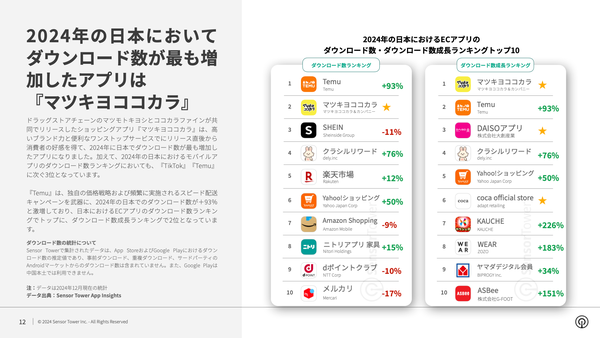 『マツキヨココカラ』はそのブランド力と卓越したサービスによって、2024年には日本国内で最もダウンロード数が増加したアプリとなりました。モバイルアプリのランキングでは、『TikTok』や『Temu』に次ぎ3位を占めています。また、MAUも増加を続け、2024年12月には前年の約4倍に達する見込みです。