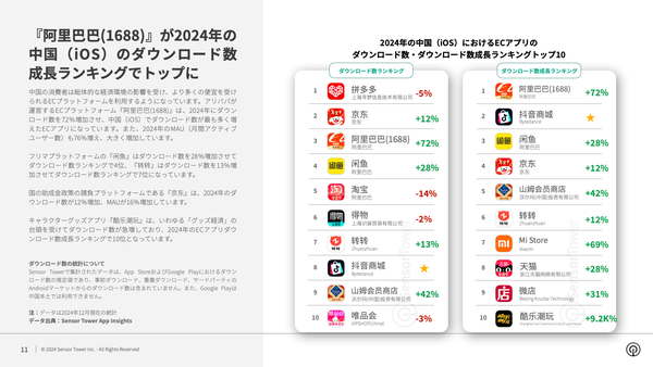 中国の消費者は経済環境の変化に応じて利便性の高いECプラットフォームの利用を始めています。アリババの『阿里巴巴(1688)』は、2024年度に72%のダウンロード数増加を記録し、中国のiOSプラットフォームで最も成長したECアプリとして急成長を続けています。また、2024年の月間アクティブユーザー数(MAU)は76%の増加を見込んでいます。