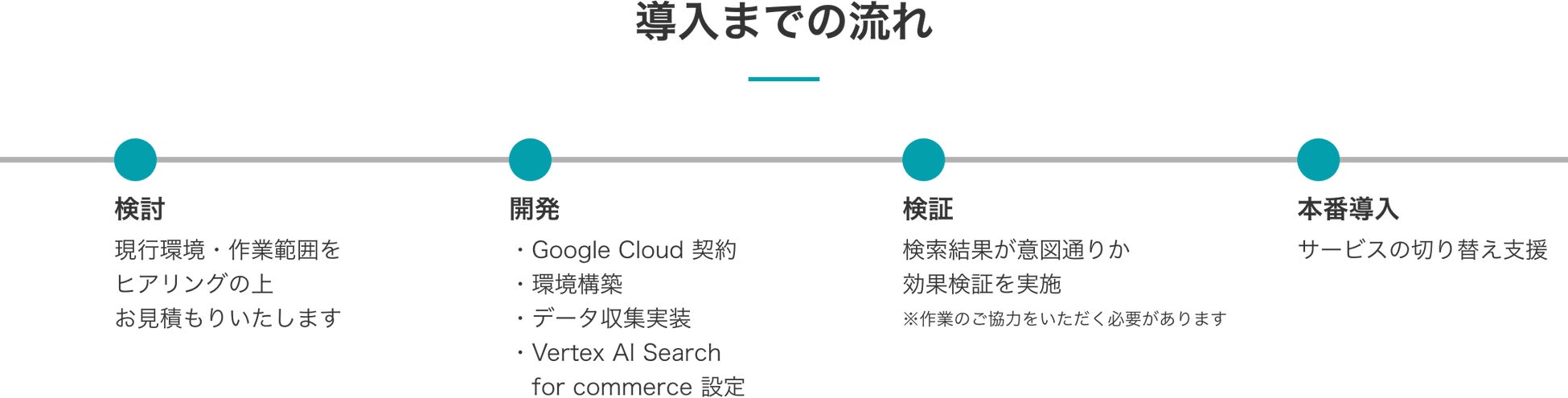 このサービスでは、Google Cloudを活用した環境構築やデータ収集基盤の開発から、「Vertex AI Search for commerce」の設定、効果検証を経て本番導入に至るまでの全てを一環して実施します。また、アイレットはパブリッククラウドの導入と活用に関する豊富な実績を基に、Google Cloud以外の基盤でも本サービスを利用可能です。