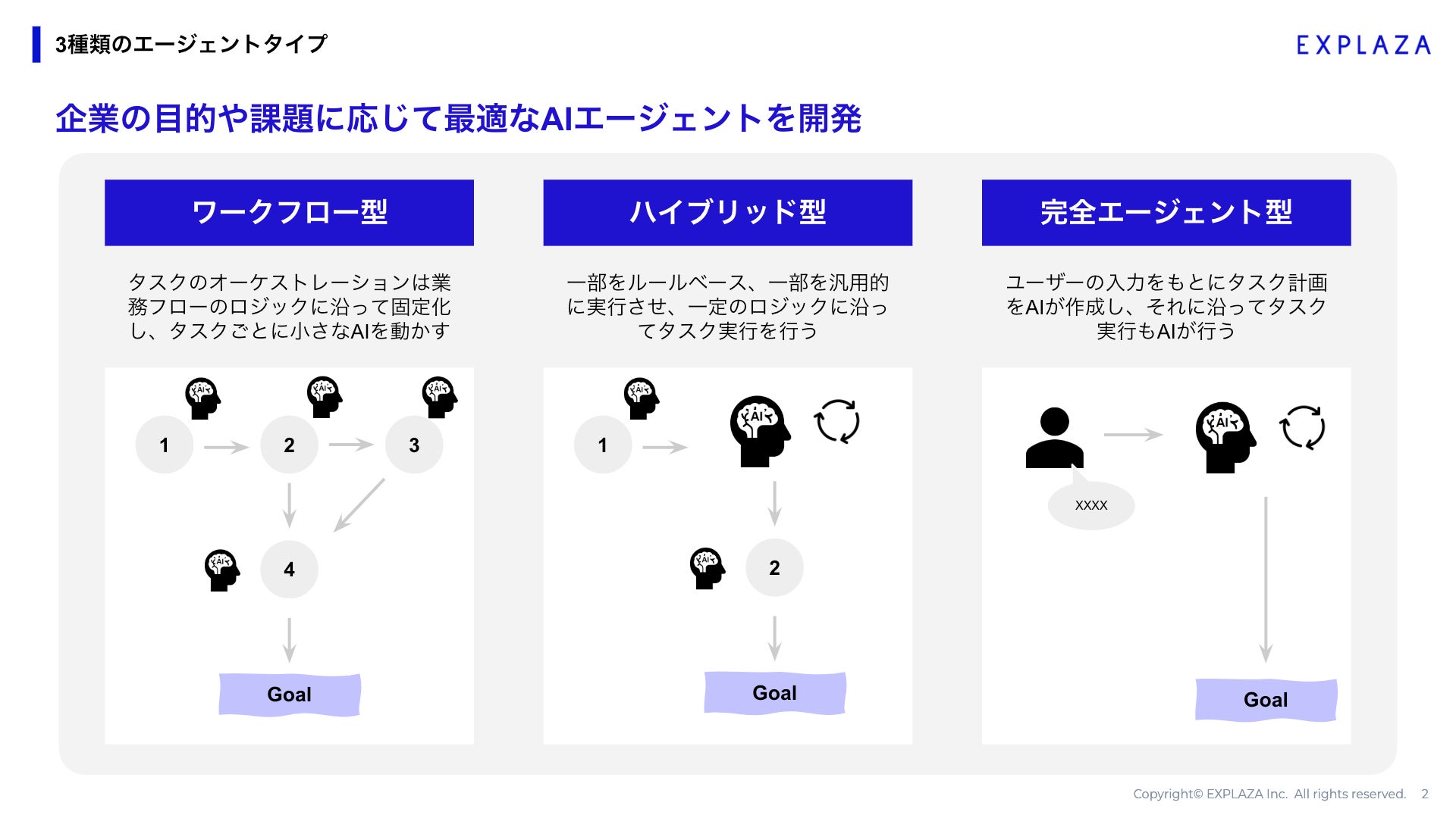 ワークフロー型、ハイブリッド型、完全エージェント型の3つの種類が用意されています。単純な定型応答から、より高度な自律対応まで、課題に応じた最適なソリューションの選択が可能です。