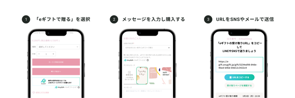 3)購入が完了すると、eギフトの受け取り用URLが発行されます。LINEやSNS、メールでそのURLを共有することで、eギフトを贈ることができます。