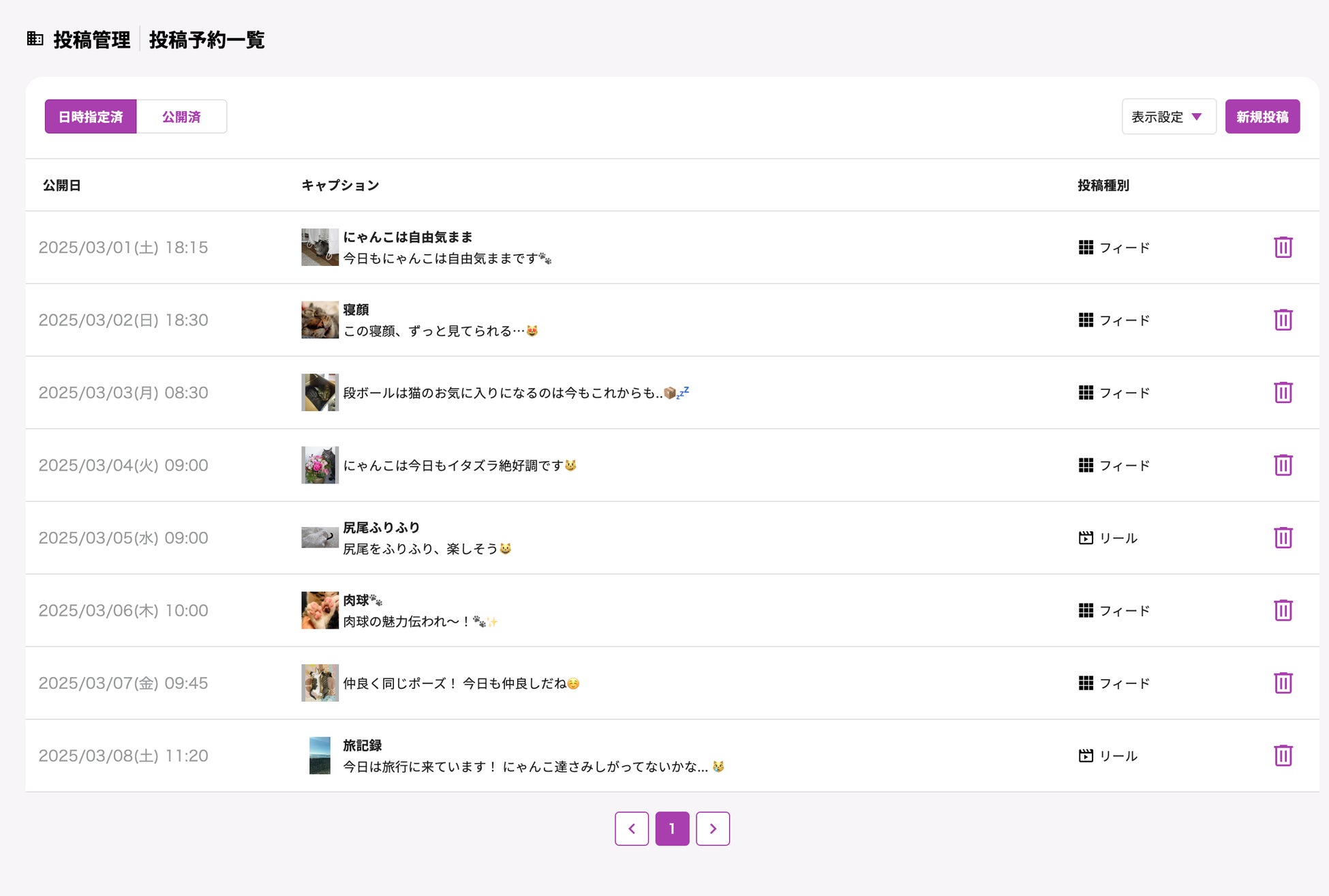 日時指定済みおよび公開済みの投稿を一覧で確認・削除できます。
