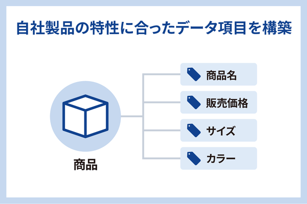 データ管理の方法は商品の特性や自社の運用に応じて異なります。EBISU PIMでは、主要な項目のほか、項目の追加や変更も可能で、各顧客に最適なデータ項目を自由に設計ビルドできます。