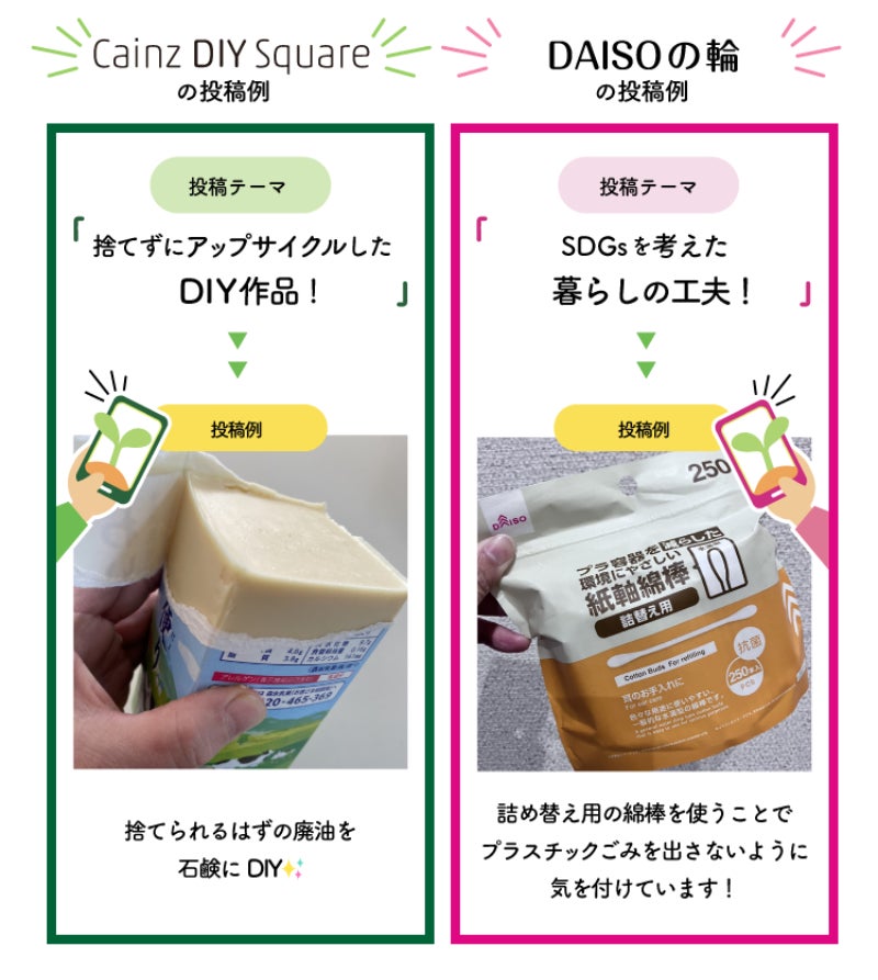 「CAINZ DIY Square」と「DAISOの輪」は、共に「ファンの皆様との共創」をコミュニティの運営理念としており、環境に配慮した商品開発などに注力しています。このキャンペーンでは、参加者に環境問題を考える機会を提供し、持続可能な社会の実現へ意識を高めることを目的としています。