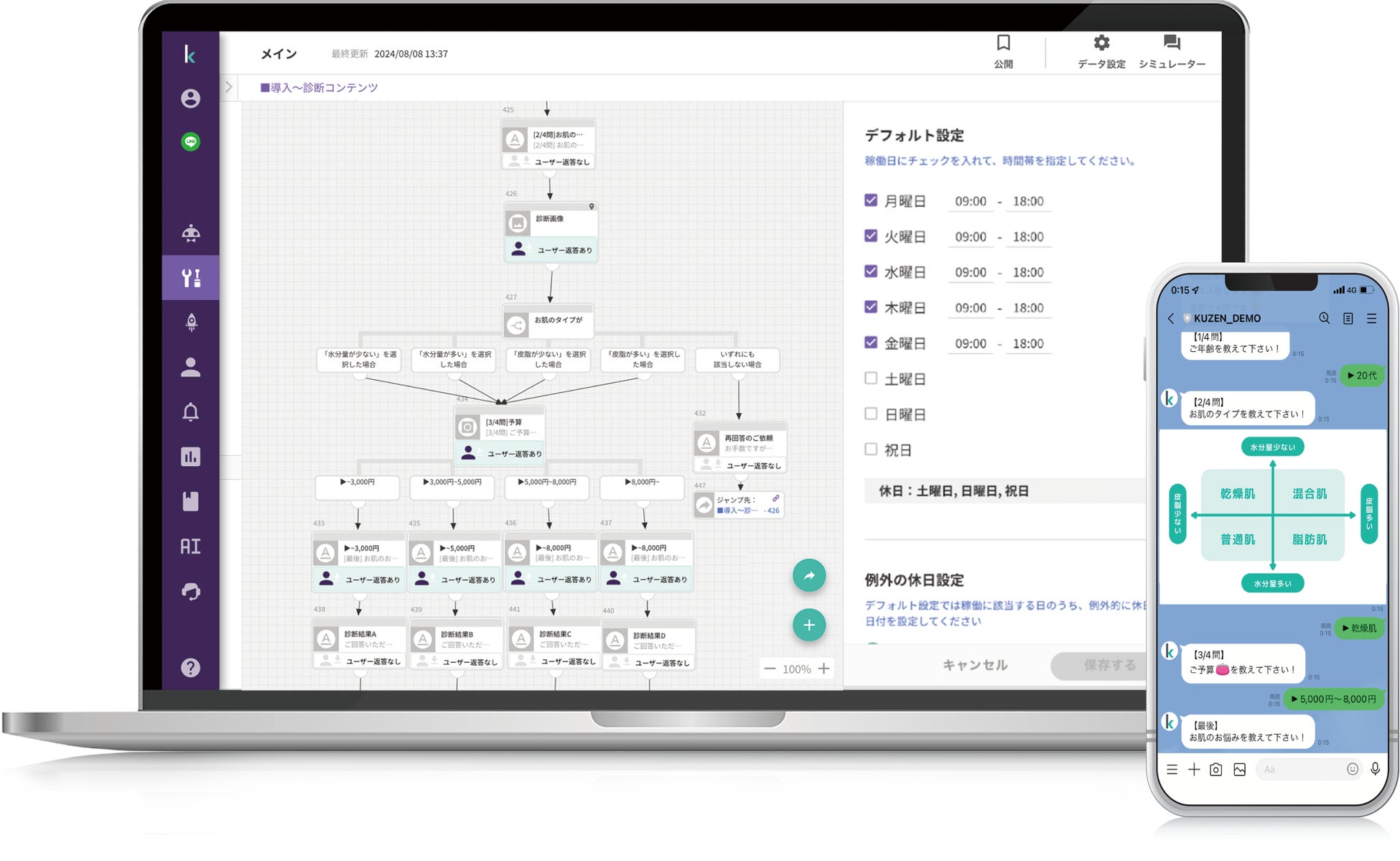 「クウゼン(KUZEN)」は、企業のマーケティング効果を向上させ、業務の効率化やデジタルトランスフォーメーション(DX)の支援を目的とした対話デザインプラットフォームです。外部のCRMやMAツール、コミュニケーションツールと柔軟に連携が可能で、充実した運用サポートを提供し、これまでに500社以上の企業に導入されています。