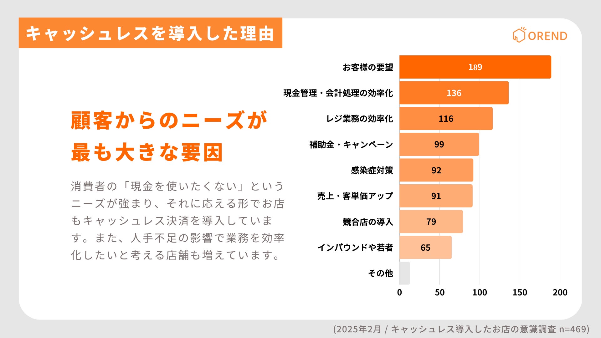 また、キャッシュレス決済を導入する理由で最も多かったのは「顧客の要望」で、消費者のニーズに応じて対応する店舗が多いことが印象的です。