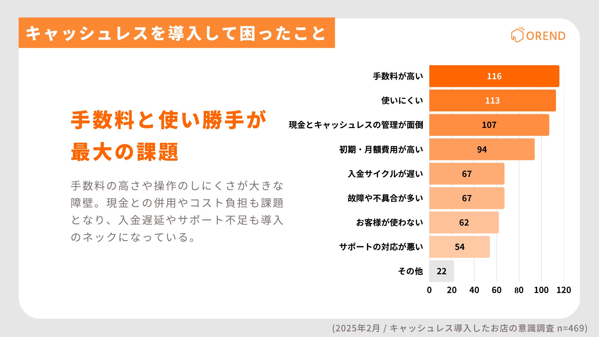 キャッシュレス決済を導入した後の課題として、24.7%が「手数料が高い」と訴えています。