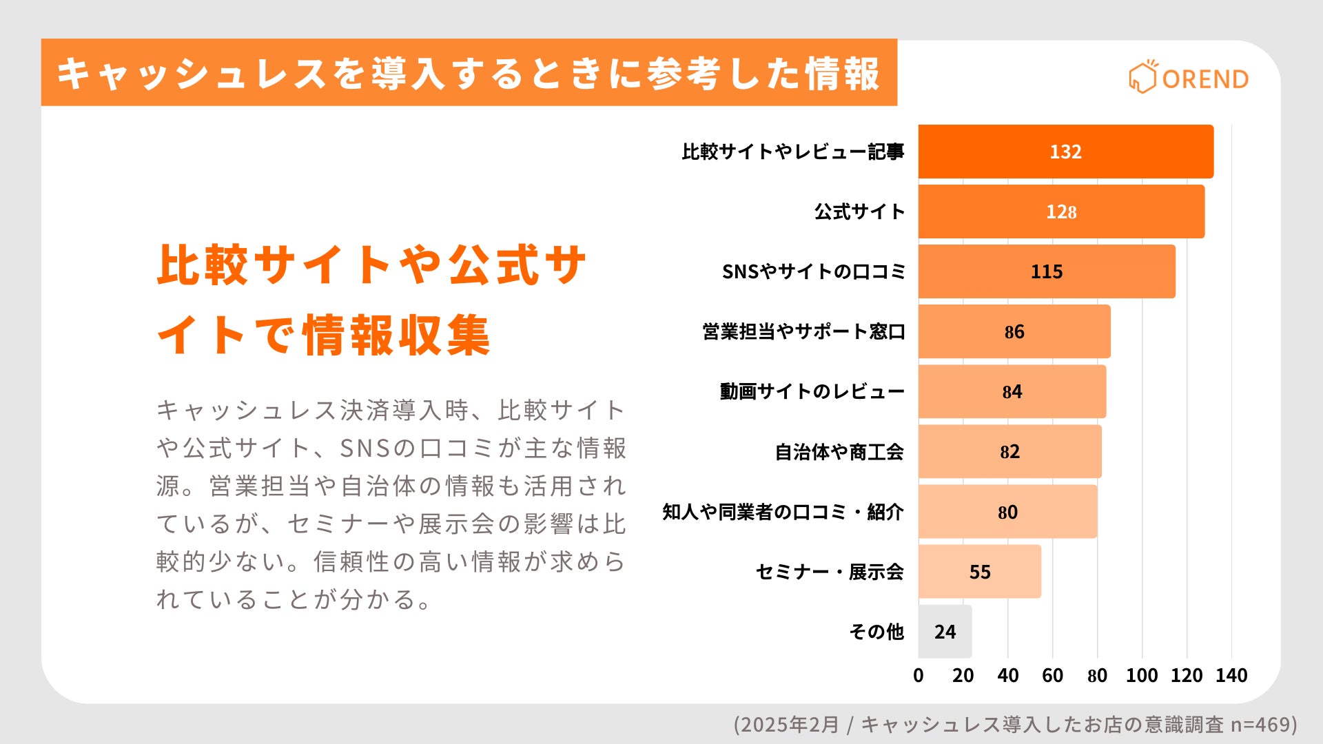 キャッシュレス決済を導入するにあたり、情報収集の手法としては28.2%が比較サイトやレビューを利用し、27.3%が公式サイトの情報を参照したと述べています。