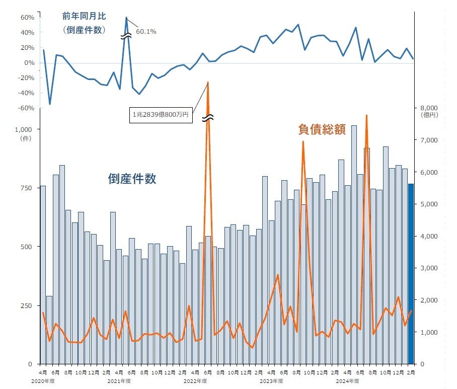 倒産態様別:「破産」は710件、2月として11年ぶりに700件超え