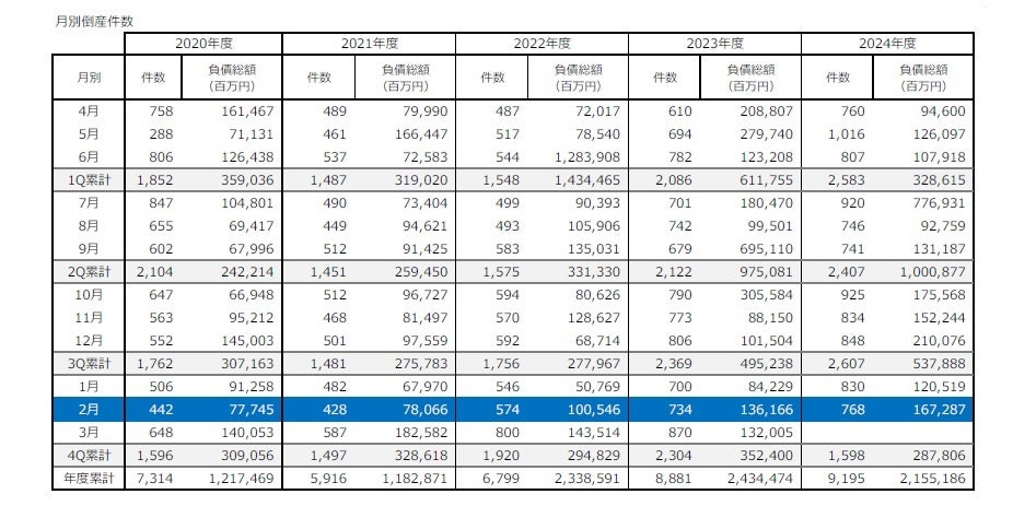 1. 2024年2月の倒産件数は768件(前年同月734件、4.6%の増加)に達しました。この数字は34カ月連続で前年を上回り、戦後最長記録を達成しています。2024年度の累計(2024年4月-2025年2月)は9195件となり、すでに2023年度(8881件)を超え、2013年度(1万102件)以来11年ぶりの1万件超えが予想されています。
