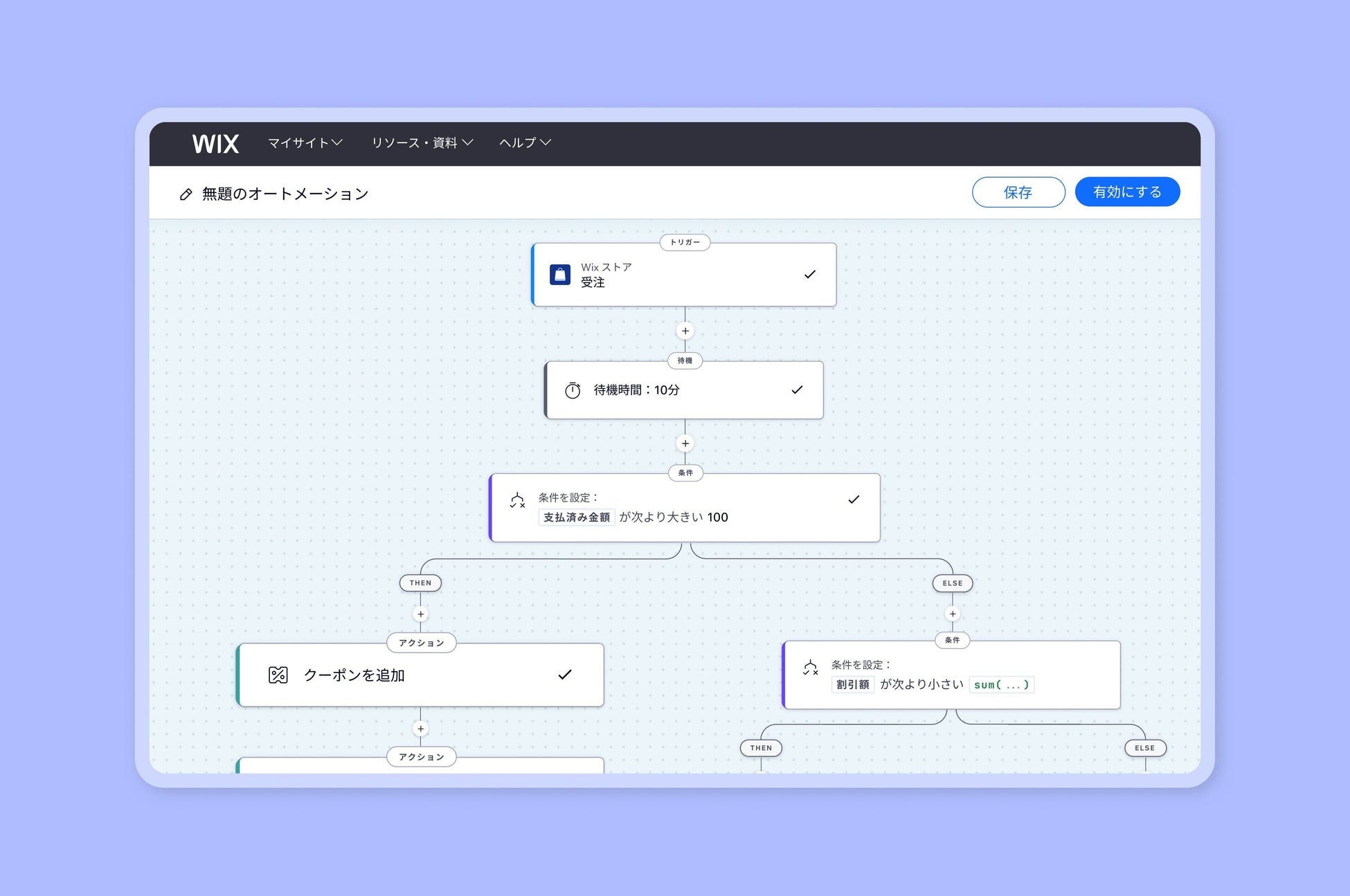この機能は、WIXストアやブッキング、イベントなど、WIXが提供するさまざまなサービスと連携しながら、高度なワークフローを設計することが可能です。例えば、顧客の購入履歴や頻度に基づくクーポンの発行、決済時の金額に応じた割引クーポンの配布などが考えられます。