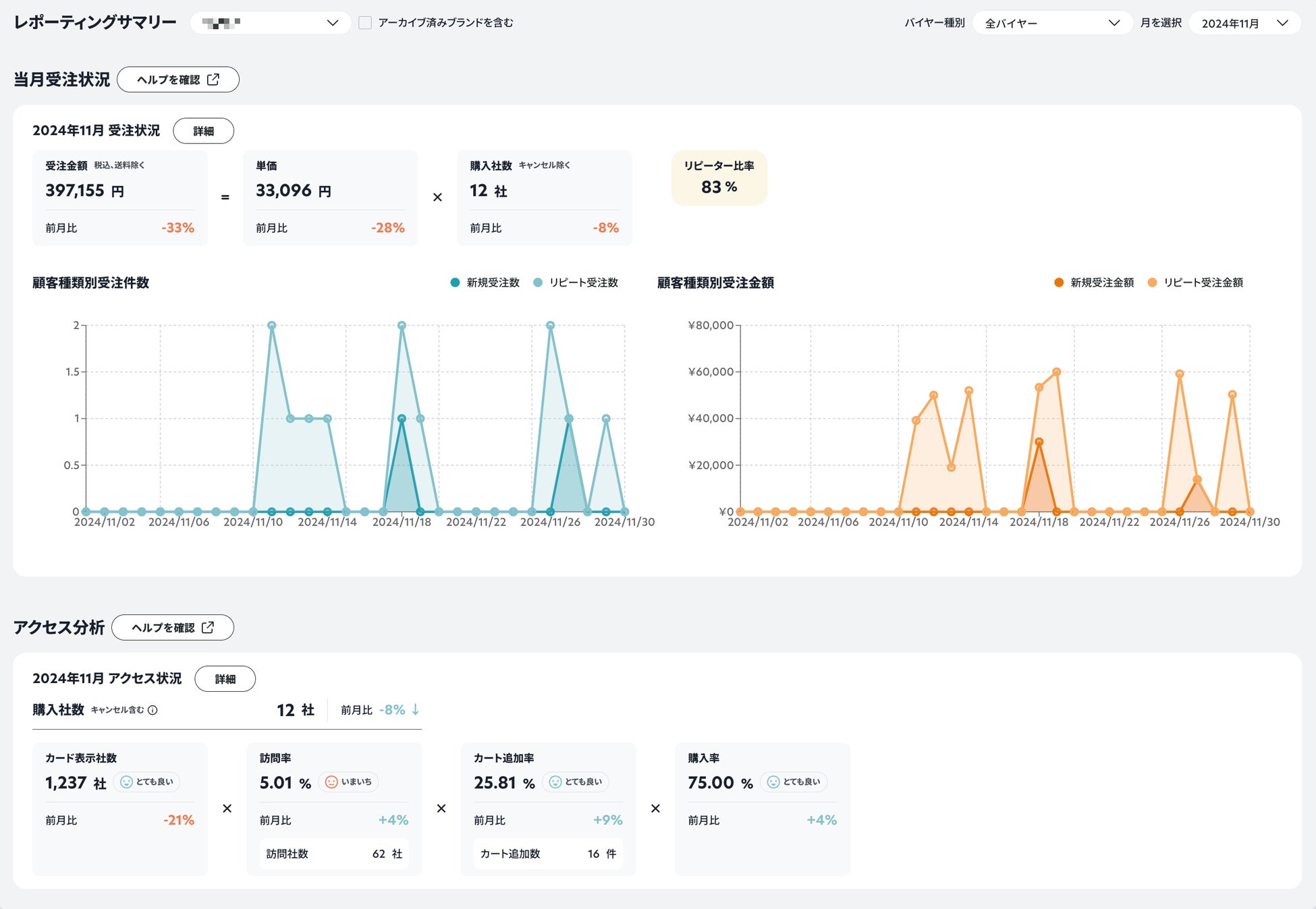 これにより、新規バイヤー数、リピートバイヤー数、リピーター比率、新規受注金額、リピート受注金額などの情報を把握することができる。売上や購入の詳細な内訳を理解し、過去の販売実績の振り返りやリピーターの割合確認に役立つ。