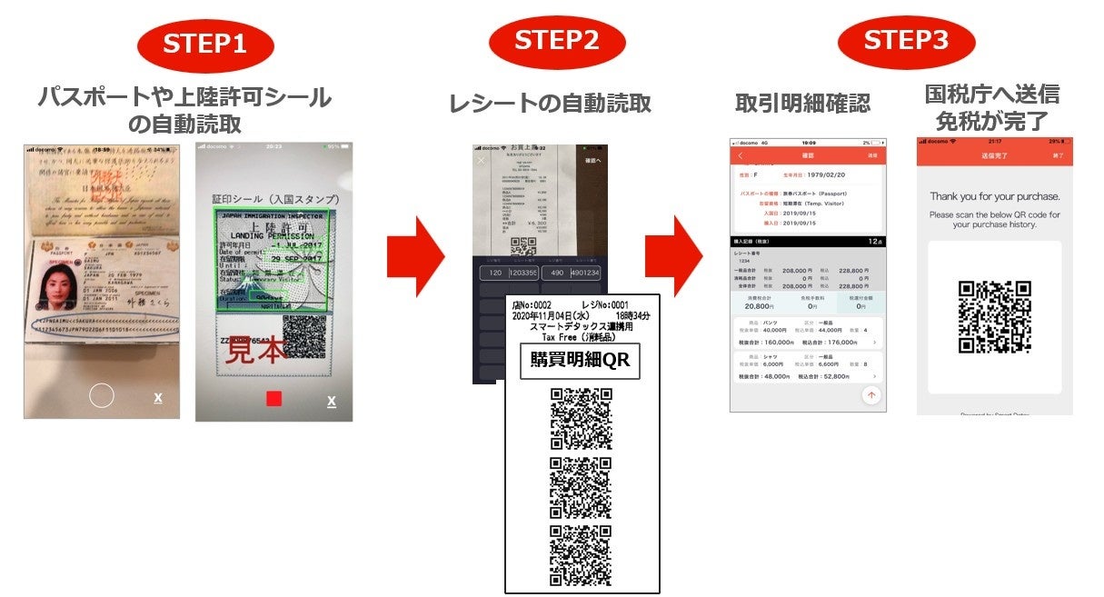 本連携により、「商メイト」と「モタクル」で発行されるレシートに購入明細をQRコードとして印刷し、これを「スマートデタックス」でスキャンすることで、免税手続きが瞬時に完了する仕組みとなっています。