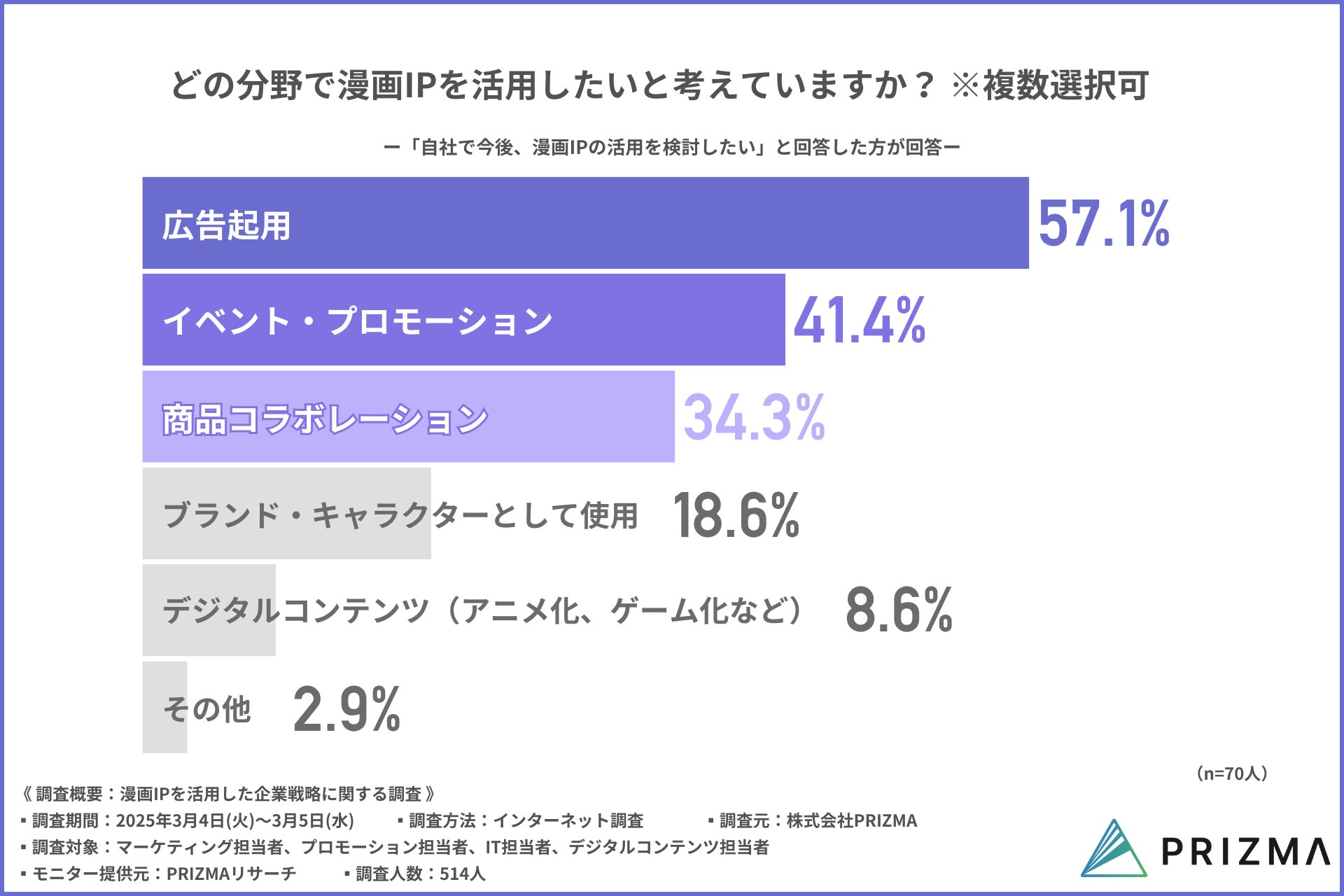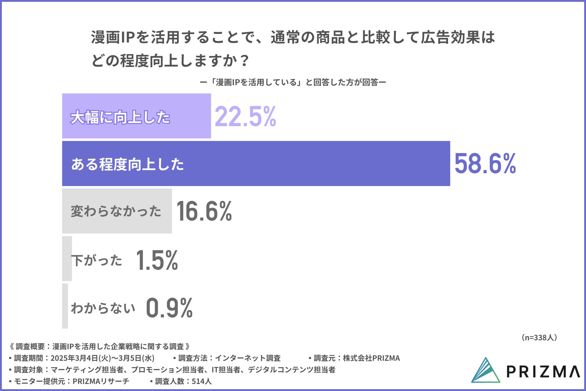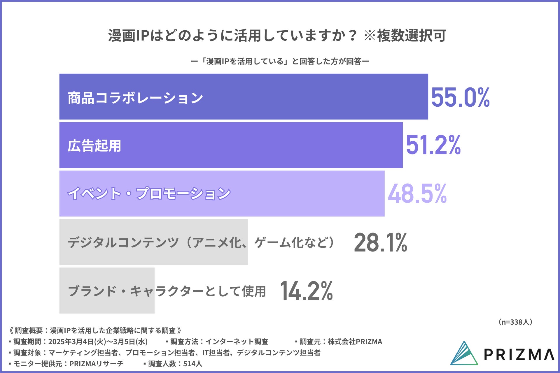 このたび、株式会社PRIZMA(https://www.prizma-link.com/manga)は、企業のマーケティング部門、プロモーション部門、IT部門、デジタルコンテンツ部門の担当者に向けて「漫画IPを利用した企業戦略に関する調査」を実施しました。