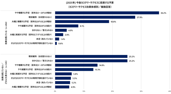 総じて、カスタマーサクセスの成果が実感できる企業は、投資を増やそうとする一方、効果を実感できていない場合には労力削減や減額を模索する傾向にあり、効果実感が投資判断において重要な要素であることが示唆されます。
