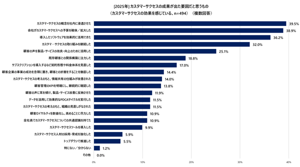 さらに、導入したソフトウェアを効果的に利用できた(36.2%)ことや、継続的なカスタマーサクセスの実施(32.0%)も効果的とされ、長期間にわたる改善や新たなツールの活用が成功に繋がることが示されています。顧客の意見を製品改善に活かすなど、顧客視点での取り組みが企業全体の成長に貢献することも伺えます。