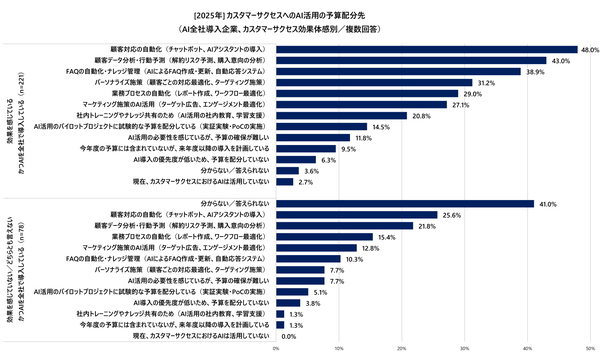 さらに、全社的にAIを導入している企業内でのカスタマーサクセスにおけるAI活用の予算配分を分析したところ、「効果実感層」(n=221)では48.0%の企業が顧客対応の自動化に予算を計上しており、顧客データ分析・行動予測(43.0%)、FAQの自動化(38.9%)、パーソナライズ施策(31.2%)への投資も見られました。社内トレーニングや知識共有に資金を投入する企業は20.8%に達し、社内全体でAI活用が促進されつつあることが伺えます。さらに、AI活用のパイロットプロジェクトに対し試験的な予算が計上されている企業も14.5%あり、増加傾向にあることが示されました。