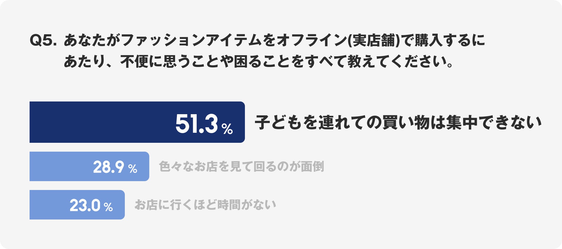 最も多い回答は「子どもを連れての買い物は集中できない(51.3%)」でした。この結果は、子どもを連れての外出がママにとって困難であることを示しています。続いて「色々なお店を見て回るのが面倒(28.9%)」、「お店に行く時間がない(23.0%)」という意見もあります。