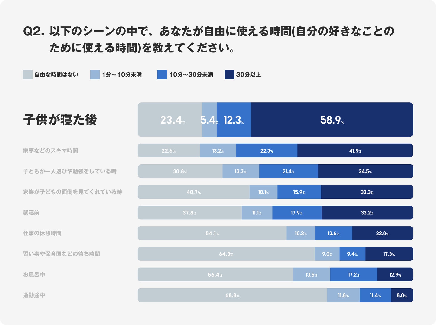 - 自由に使える時間が最も多いのは「子どもが寝た後(58.9%)」であり、平均42分です。