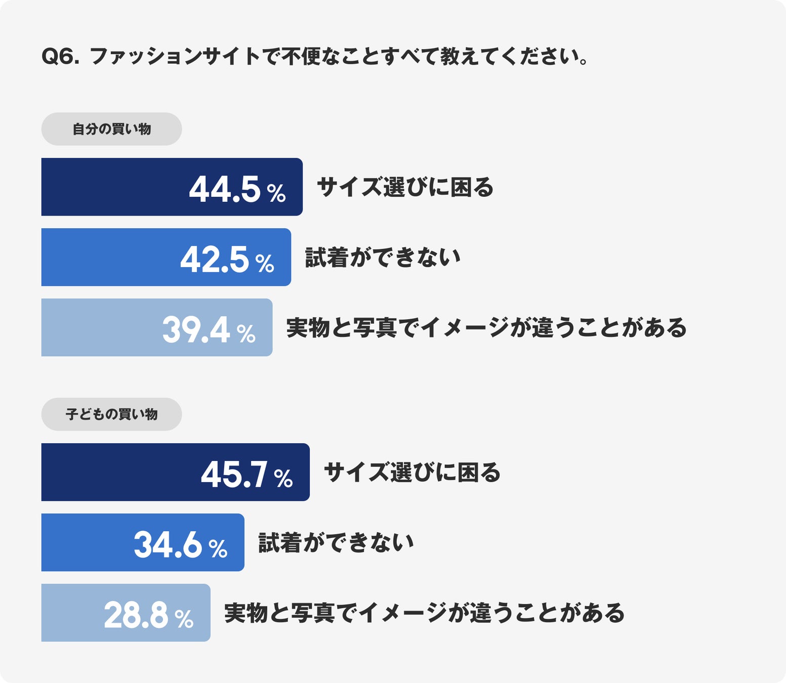 ファッション通販における不満として「サイズ選びに困る」「試着ができない」「実物と写真でイメージが異なる」という問題が上位に上がっています。これらの悩みは、子ども用とママ自身のどちらの購入時にも共通しています。
