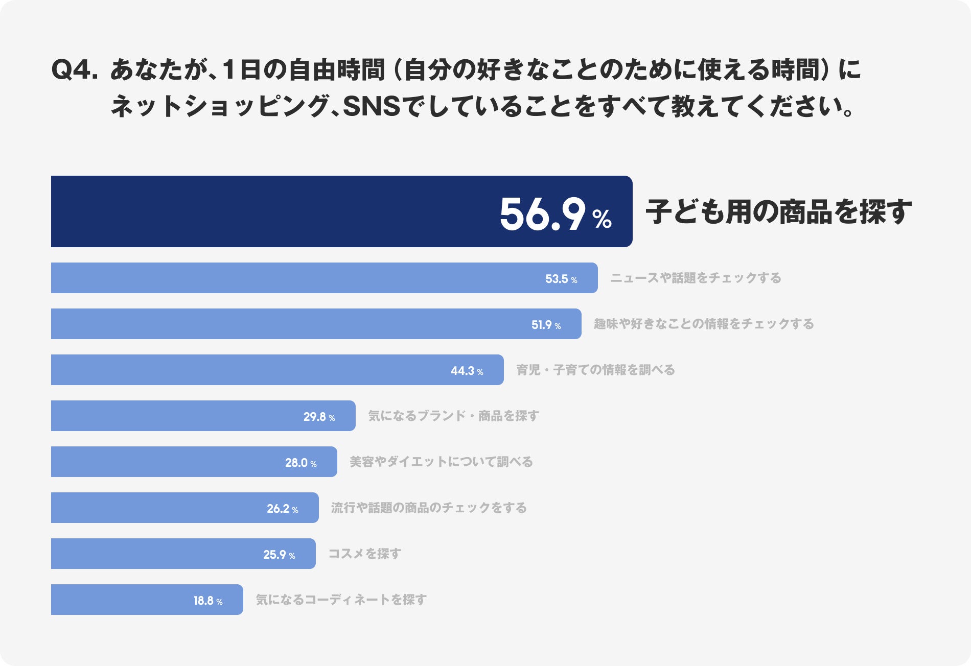 - ネットショッピングやSNSでの活動では「子ども用の商品を探す(56.9%)」が最も多いです。