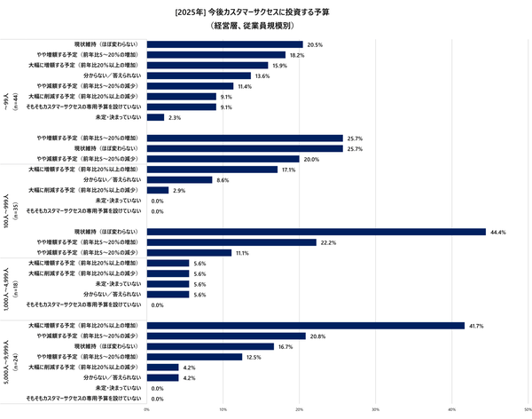 対して、1,000人から4,999人の大企業では、「現状維持」が44.4%で最も多く、投資を控えつつもカスタマーサクセスに取り組む慎重さが目立ちます。