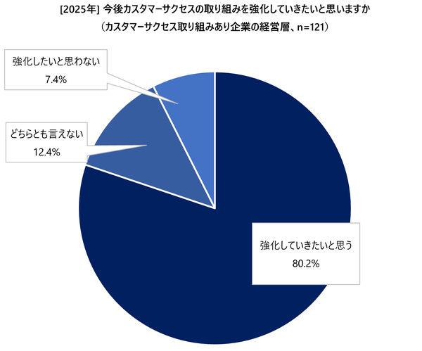 カスタマーサクセスに今後の取り組み意向を尋ねたところ、80.2%が「さらなる強化をしたい」との回答を得られました。「どちらとも言えない」との回答は12.4%、逆に「強化したいとは思わない」との回答が7.4%に留まり、大半の企業がカスタマーサクセスの拡充を重要視していることが示されます。