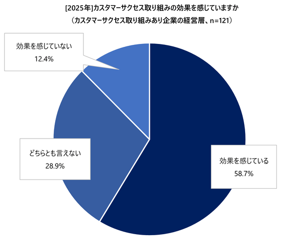 さらに、「これまでのカスタマーサクセスの取り組み効果を実感していますか?」との問いに対し、58.7%が「効果を感じている」との回答をし、経営戦略の一環としてカスタマーサクセスの価値が認識されつつあることが見て取れます。ただし、28.9%が「どちらとも言えない」、12.4%が「効果を感じていない」と回答し、全ての企業が充分な成果を把握しているわけではない状況が示されています。