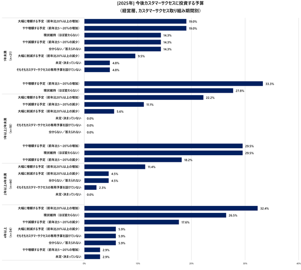 4年以上継続してカスタマーサクセスに取り組む企業では、「大幅に増加する」との意向が32.4%で非常に高いですが、「現状維持」や「減額」といった意見も存在し、投資拡大と見直しの両方が見られます。