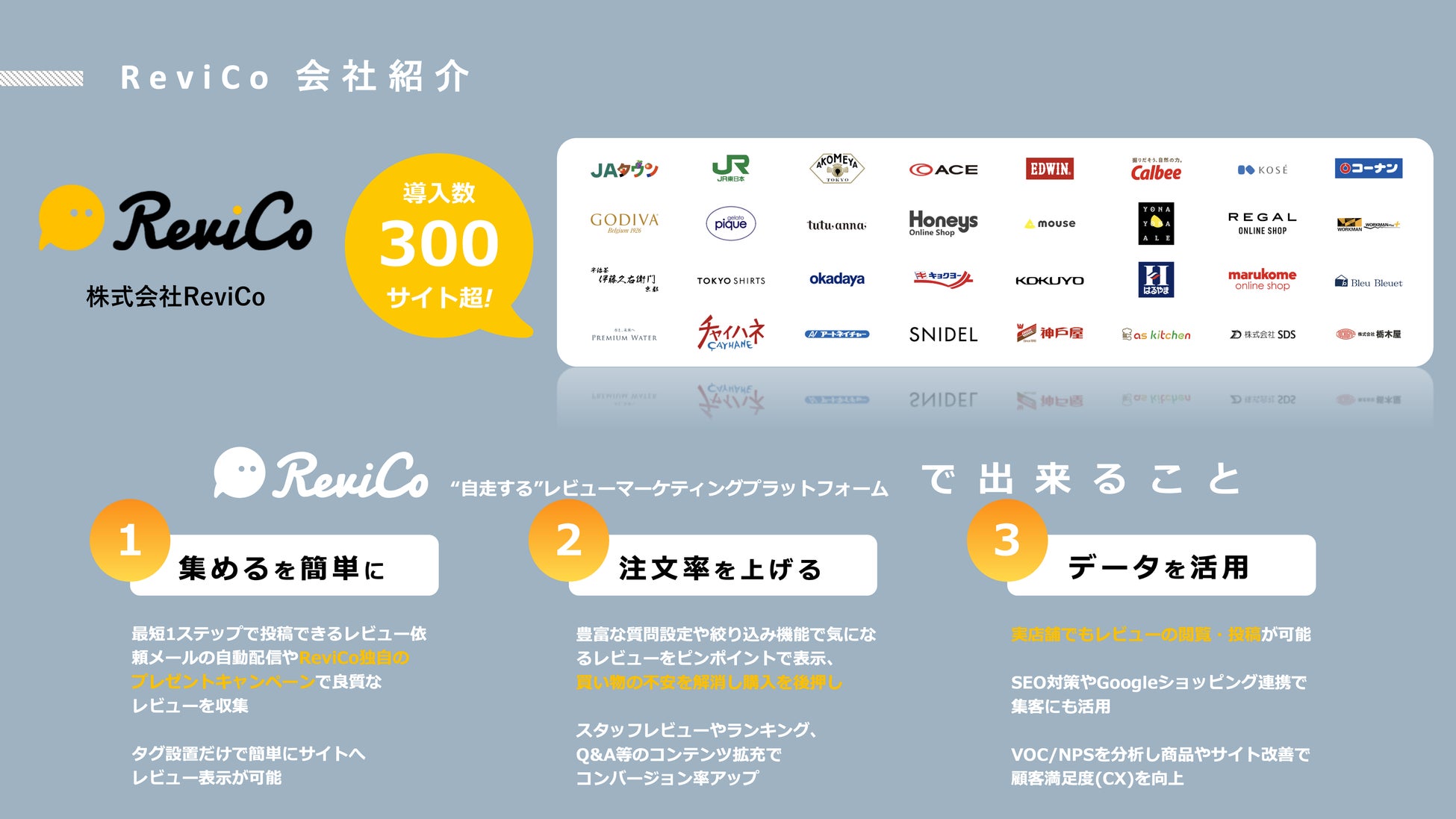 「ReviCo」は、300以上のECサイトで導入されているレビューマーケティングプラットフォームで、ECサイトや実店舗を超えて商品の体験をした消費者から良質なレビューを集め、それをサイト内に表示しています。さらに、収集したデータを分析し、マーケティングに活かすことでコンバージョン率の向上やユーザー間のコミュニケーションを促進しています。