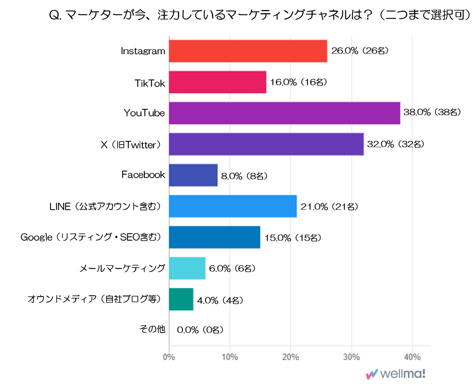 マーケティング専門家の関心や課題に応えるべく、次世代型プラットフォーム「Wellma(ウェルマ)」が、2025年3月18日にマーケター100名を対象に「マーケターが注力しているマーケティングチャネルは?」というテーマで独自のアンケートを実施しました。