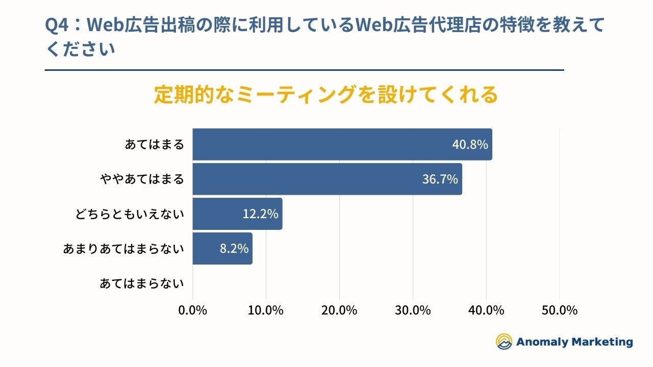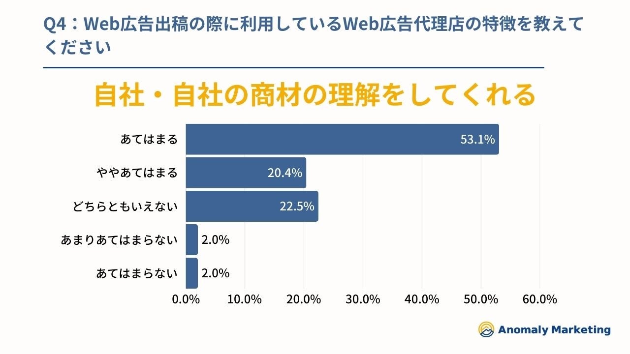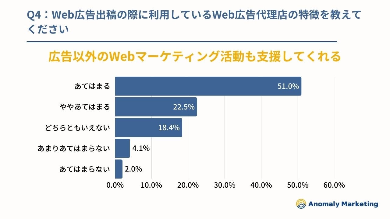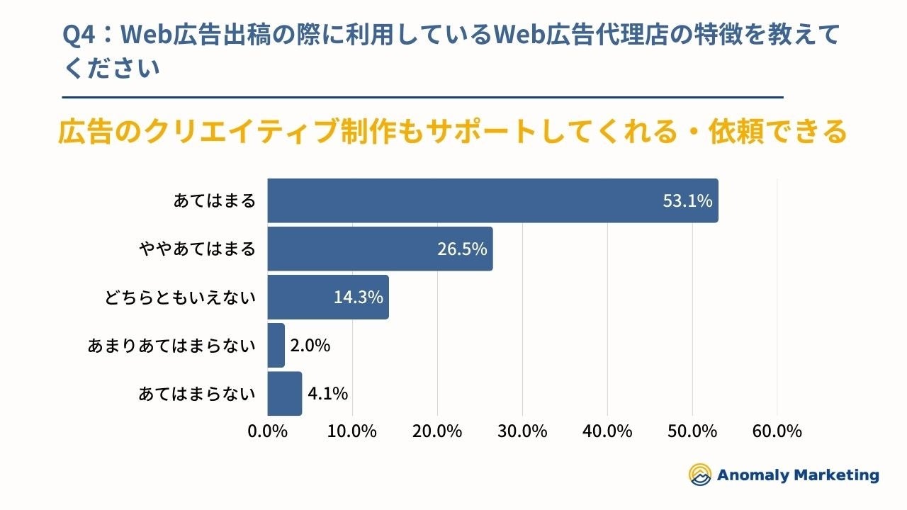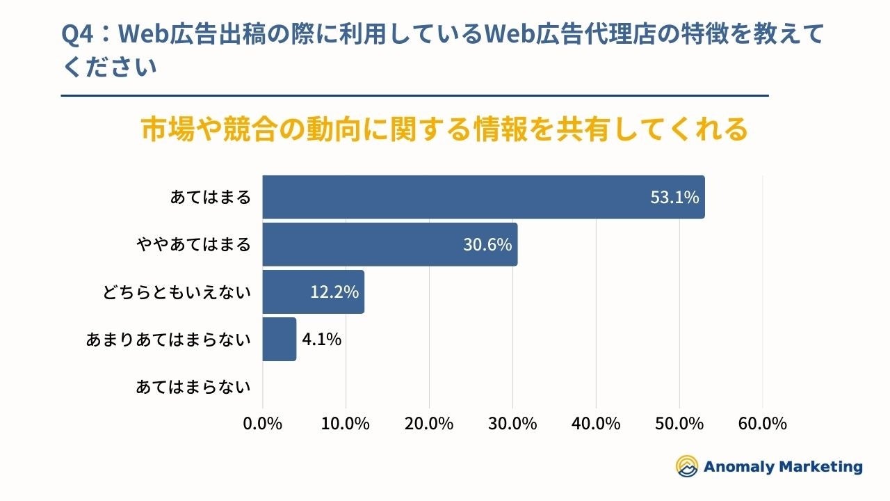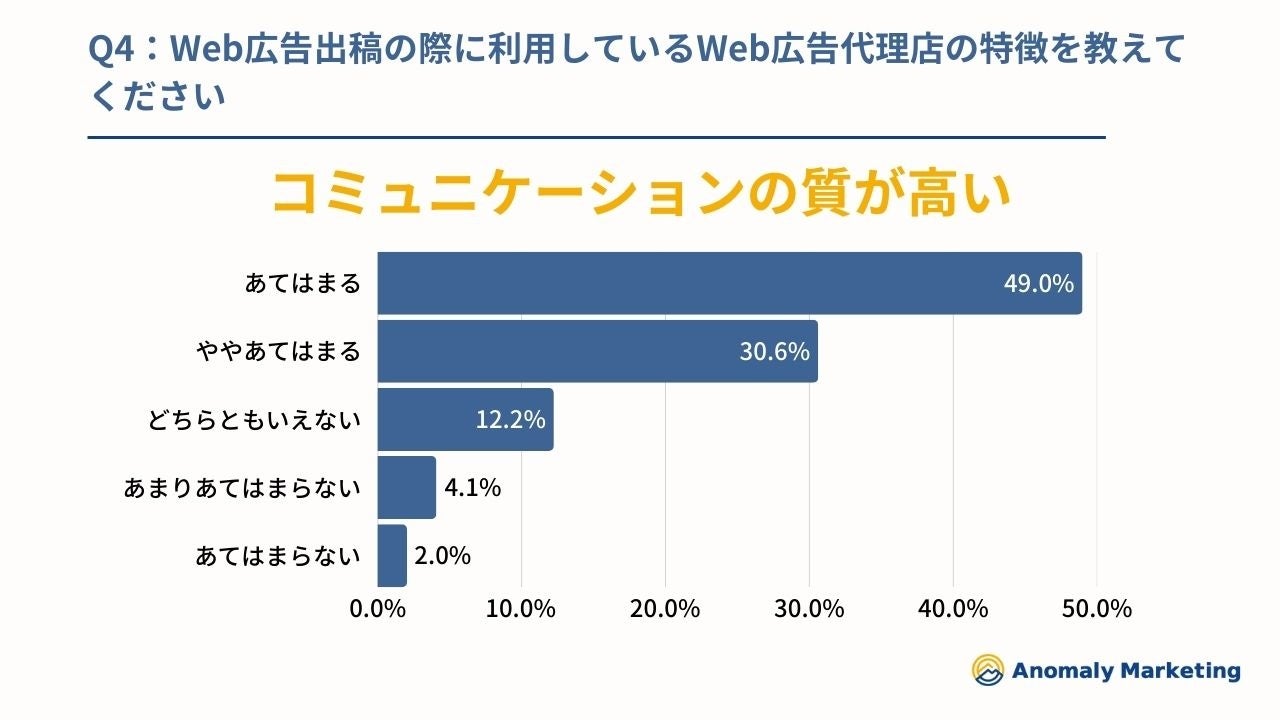 多くの回答者が「当てはまる」または「やや当てはまる」とした要素の中で、特に高かったのは「市場や競合の動向に関する情報を共有してくれる(約84%)」「質の高いコミュニケーションを提供してくれる(約80%)」「広告のクリエイティブ制作もサポートしてくれる(約80%)」という結果です。