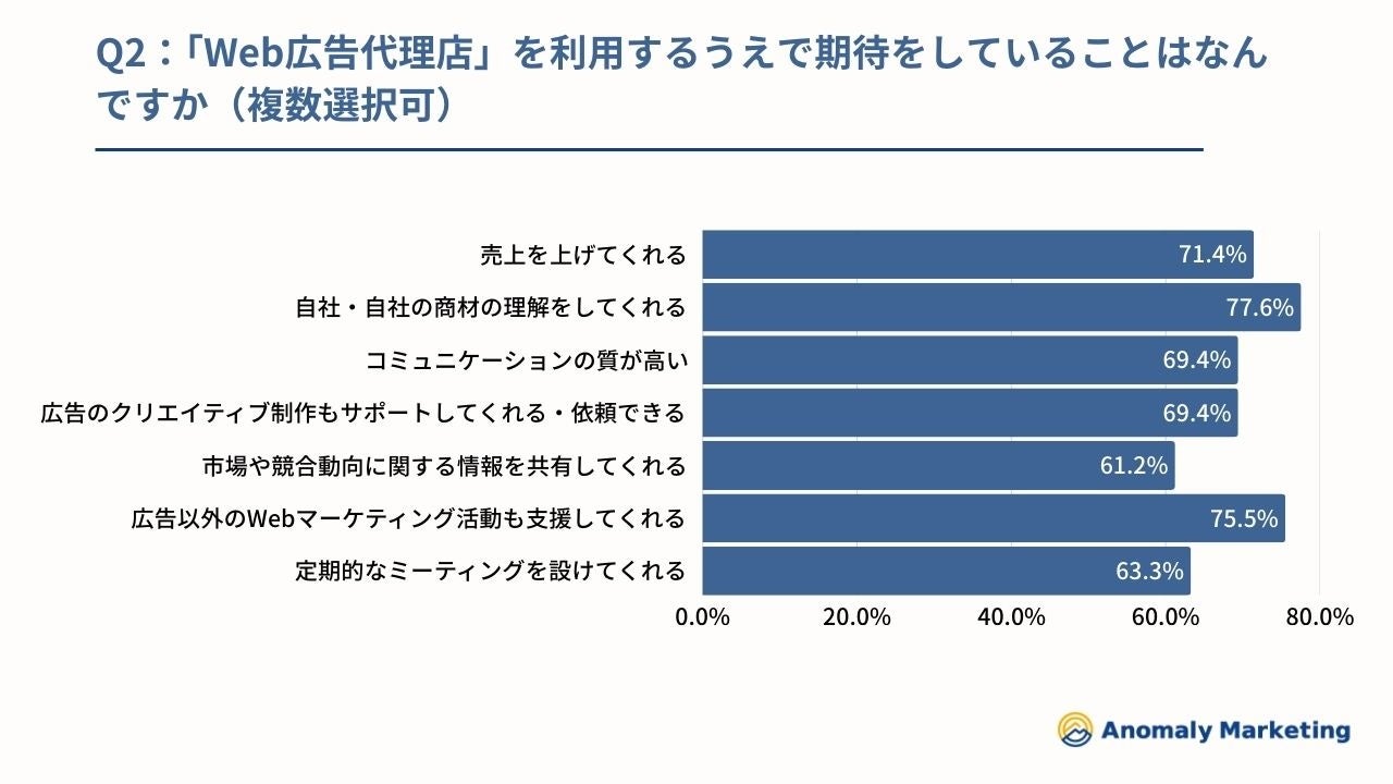 上位3つの期待項目は「自社・自社の商材を理解してくれる(約77%)」、「広告以外のWebマーケティング活動も支援してくれる(約76%)」、「売上を上げてくれる(約71%)」という結果でした。