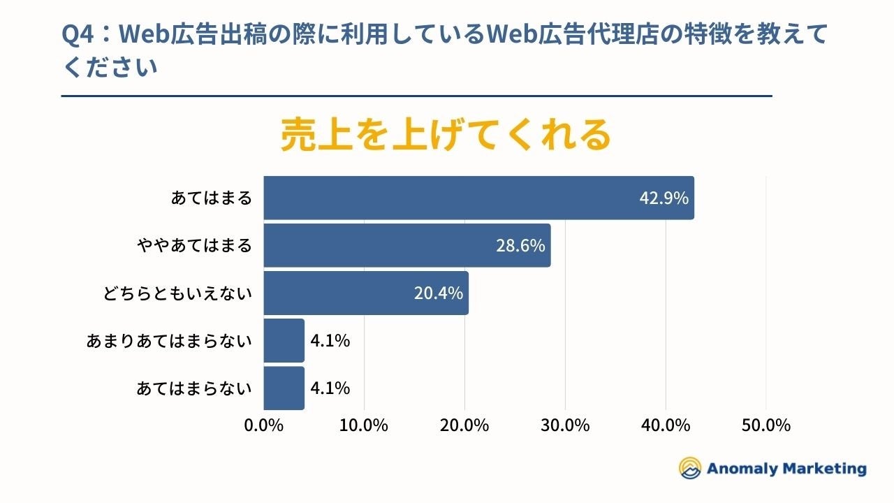 アノマリーマーケティング株式会社(本社:名古屋市中区栄2丁目2-21)が実施した調査によると、Web広告代理店を利用した経験のある方々に向けて、代理店に求める期待や成功を収めやすい特徴についての意識調査が行われました。