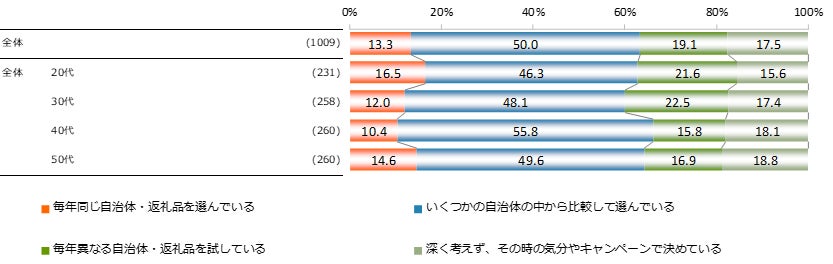 寄付先の選び方について、半数近くが「いくつかの自治体の中から比較して選んでいる」と回答しています。「毎年異なる自治体・返礼品を試している」という人は19.1%、「毎年同じ自治体・返礼品を選んでいる」という人は13.3%でした。