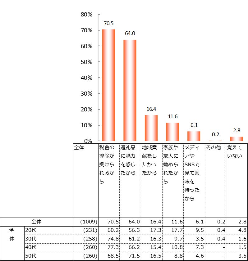 7割以上が「返礼品の内容・魅力」を基準に寄付先を選ぶ。寄付先に対し「応援したい気持ち」と「返礼品をもらうための手続きという意識」が約4割で拮抗。