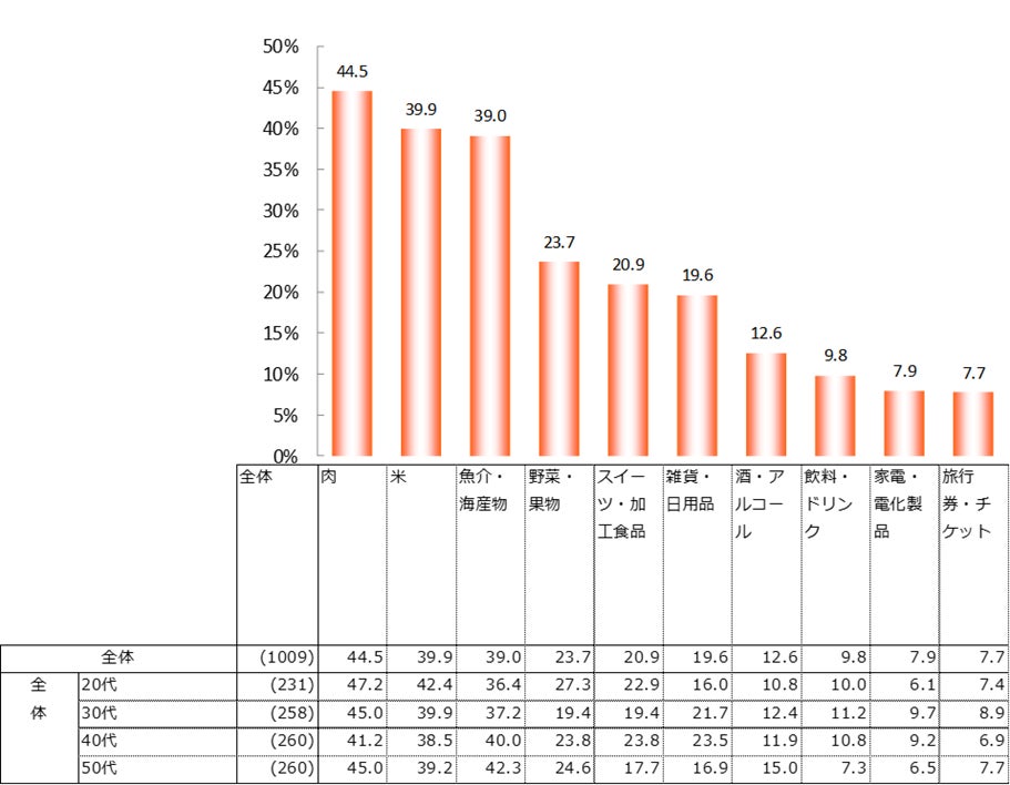今年、申し込みたい返礼品のトップは「肉」で44.5%、次いで「米」が39.9%、「魚介・海産物」が39.0%となっています。