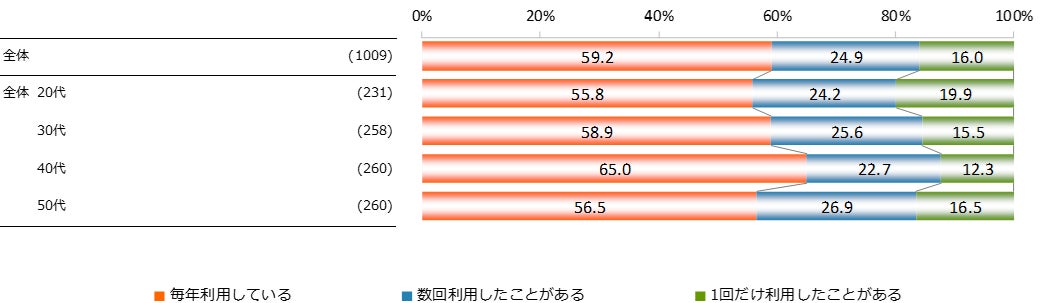 ふるさと納税の利用経験者の約6割が「毎年利用している」との回答があり、全年代で過半数を占め、利用経験者の中で特に「税金の控除が受けられるから」という理由で始めた人は約7割となっています。「返礼品に魅力を感じたから」という人も約6割に達し、「地域貢献をしたかったから」との回答は16.4%となっています。