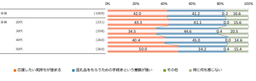 また、ふるさと納税を通じて寄付した自治体に対する気持ちとしては、「応援したい気持ちが強まる」と答えた人が42.0%、「返礼品をもらうための手続きという意識が強い」との回答が41.2%で対立していることがわかりました。