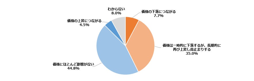 政府の備蓄米放出によるコメ価格への影響については「ほとんど影響がない」と答えた人が44.8%で最も多く、次に「一時的に価格が下がるが、長期的には再び上昇する」が35.0%、「価格が下落する」との回答は7.7%でした。