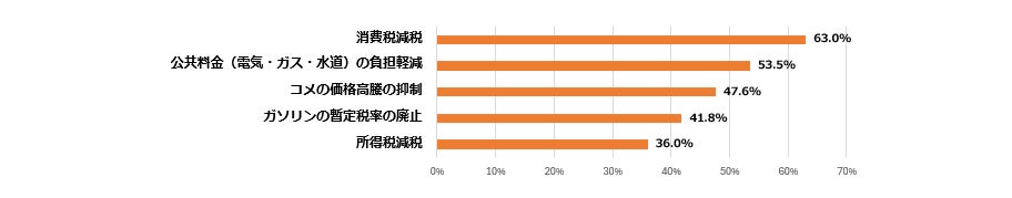 政府が行うべき物価高対策として多くの人が重視している点(複数回答)では、上位3つは「消費税減税」が63.0%、「公共料金(電気・ガス・水道)の負担軽減」が53.5%、「コメの価格高騰の抑制」が47.6%という結果となっています。