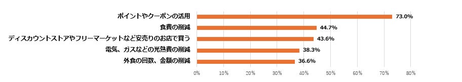 自身の物価高対策としての行動(複数回答)の上位3つは「ポイントやクーポンの活用」が73.0%(前回調査61.8%)、「食費の削減」が44.7%(前回調査45.1%)、「ディスカウントストアやフリーマーケットでの購入」が43.6%(この選択肢は前回調査にはありません)でした。