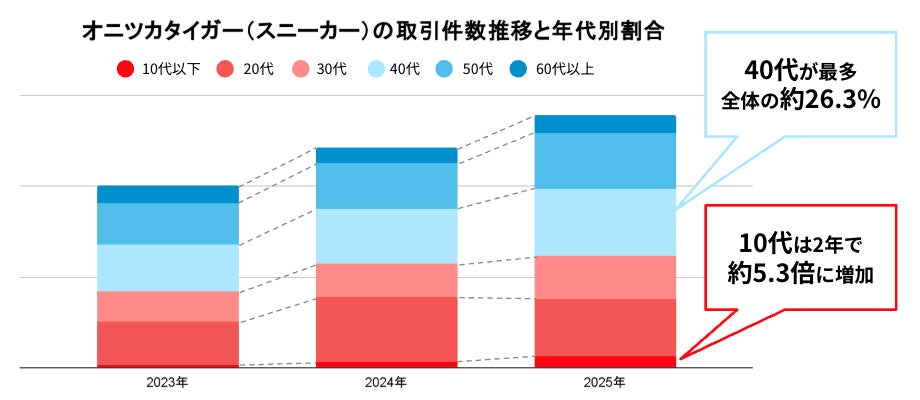 また、2025年1月から3月15日までの「メルカリ」における「オニツカタイガー(スニーカー)」の取引について調査した結果、2025年には40代の利用者が最も多く、全体の約26.3%を占めました。