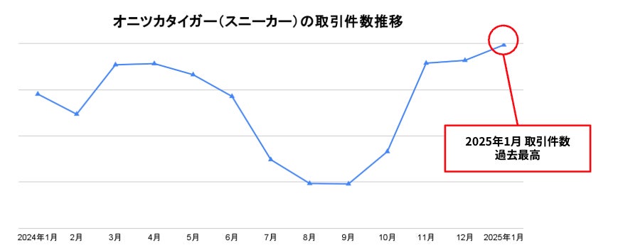 2024年は「オニツカタイガー」の誕生75周年ということもあり、特別なアイテムの発売や記念イベントが多く行われ、注目を集めました。また、その高品質から「メルカリ」でも「オニツカタイガー(スニーカー)」の取引件数は年々増加しています。2025年1月には取引件数が過去最高を記録しました。