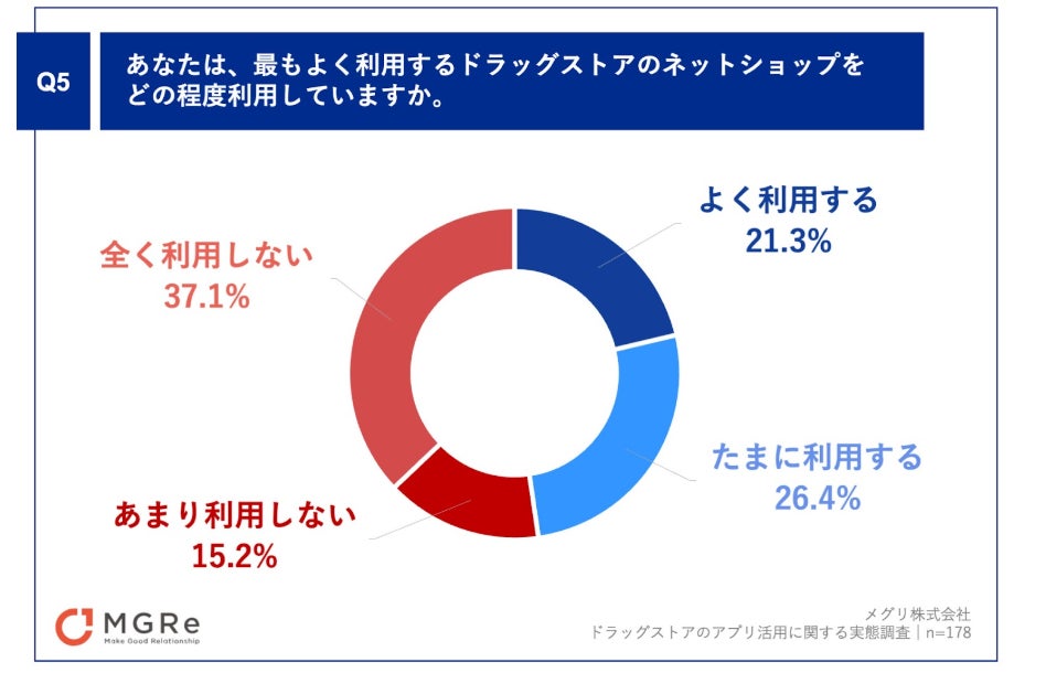 「Q4で運営している」と答えた方に「Q5.あなたは最も利用するドラッグストアのネットショップをどの程度利用していますか。」に対し、「よく利用する」が21.3%、「たまに利用する」が26.4%でした。