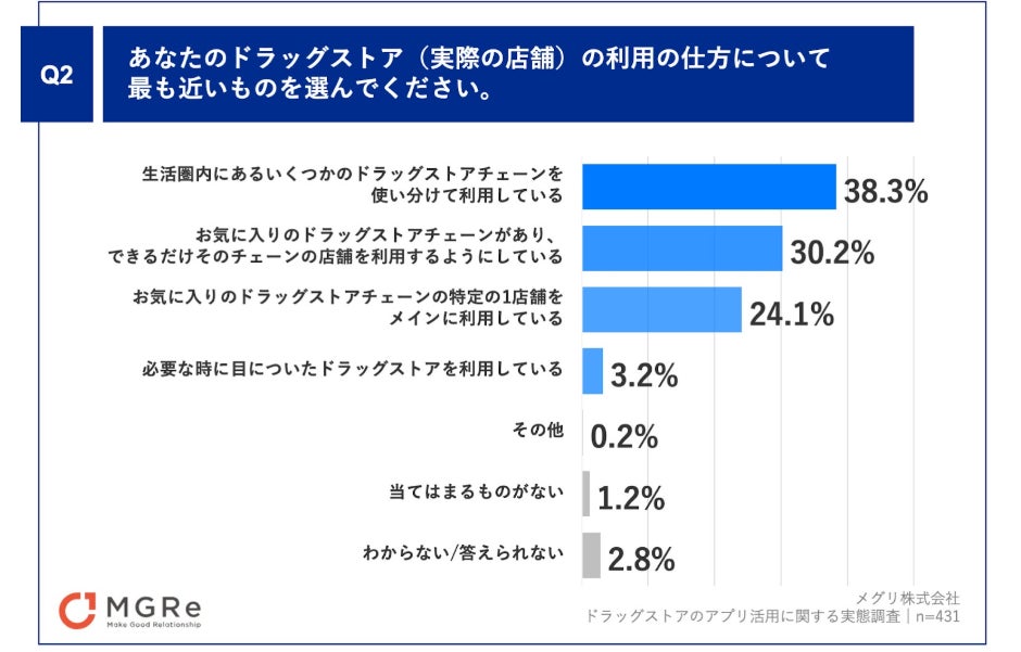 「Q2.あなたのドラッグストア(実店舗)の利用スタイルについて最も近いものを選んでください。」という質問に対する回答は次の通りです。「生活圏内の複数のドラッグストアチェーンを使い分けて利用している」が38.3%、「お気に入りのドラッグストアチェーンがあり、その店舗を可能な限り利用している」が30.2%、「お気に入りの特定のドラッグストア店舗を主に利用している」が24.1%という結果が得られました。