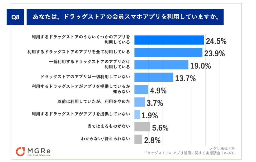 「Q8.あなたはドラッグストアの会員アプリを利用していますか?」という質問に対し、「いくつかのアプリを利用している」が24.5%、「利用しているアプリを全て使用している」が23.9%、「一番利用しているドラッグストアのアプリだけを利用」という回答が19.0%でした。