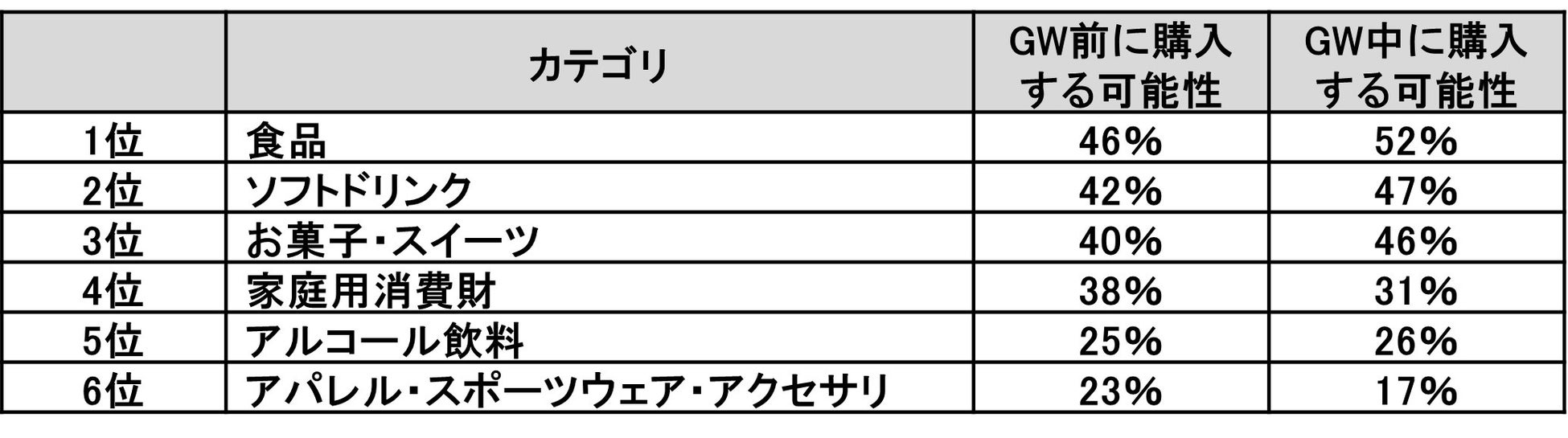 - 食品、スナック、清涼飲料水、アルコール飲料、家庭用品はGW前およびGW期間中の購入可能性が高い商品カテゴリとして挙げられます。